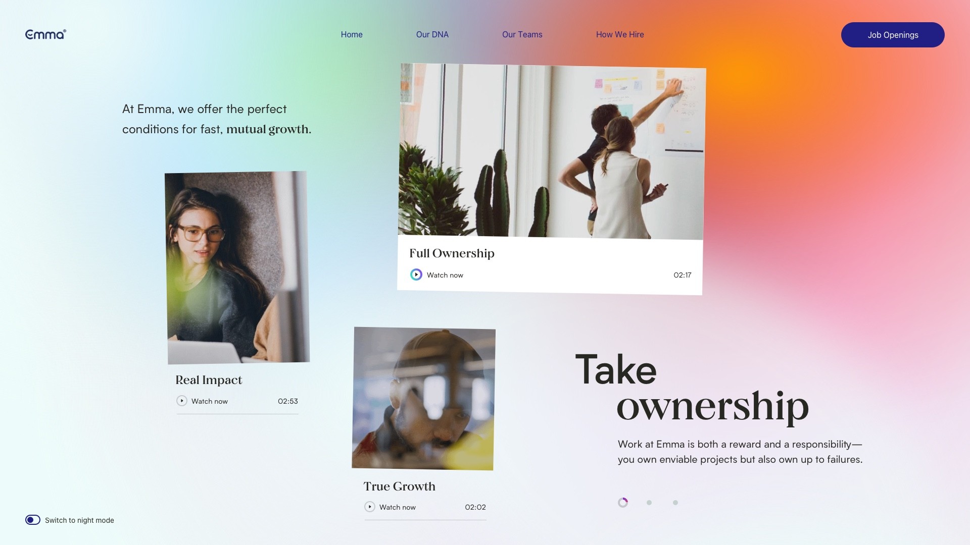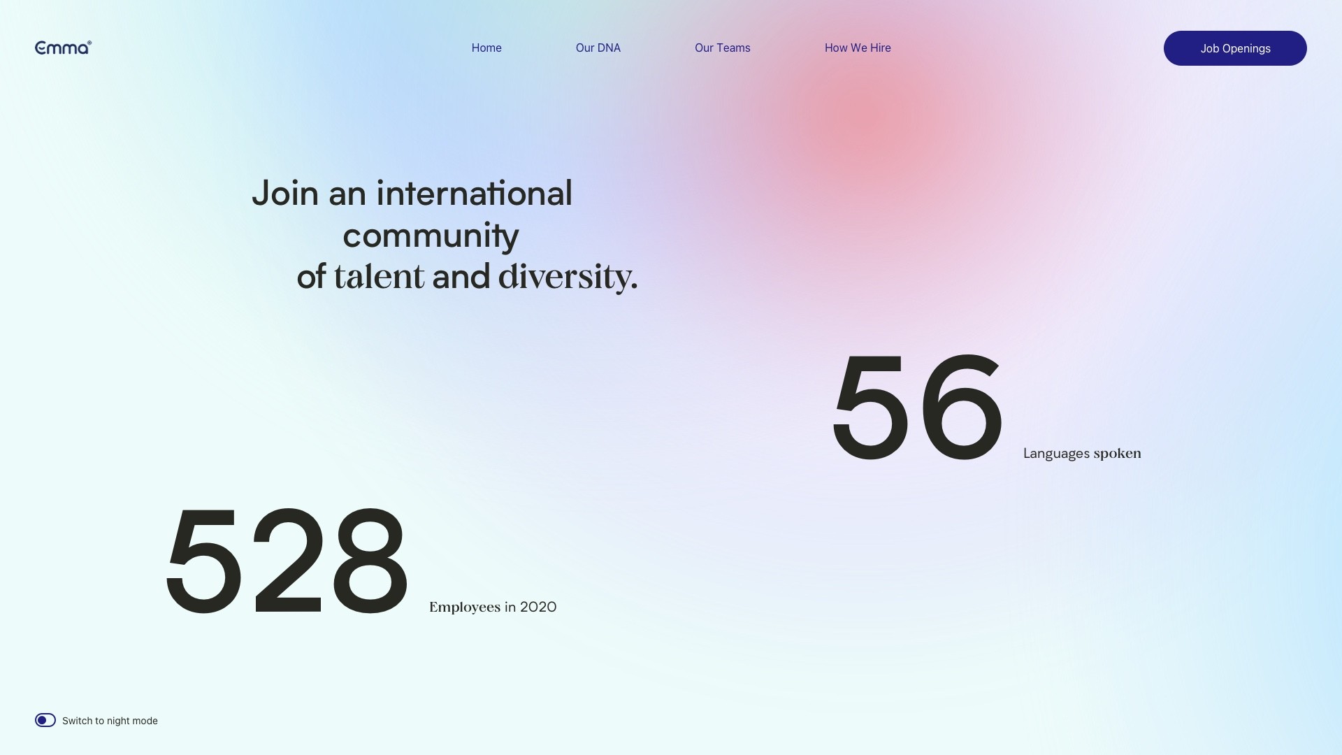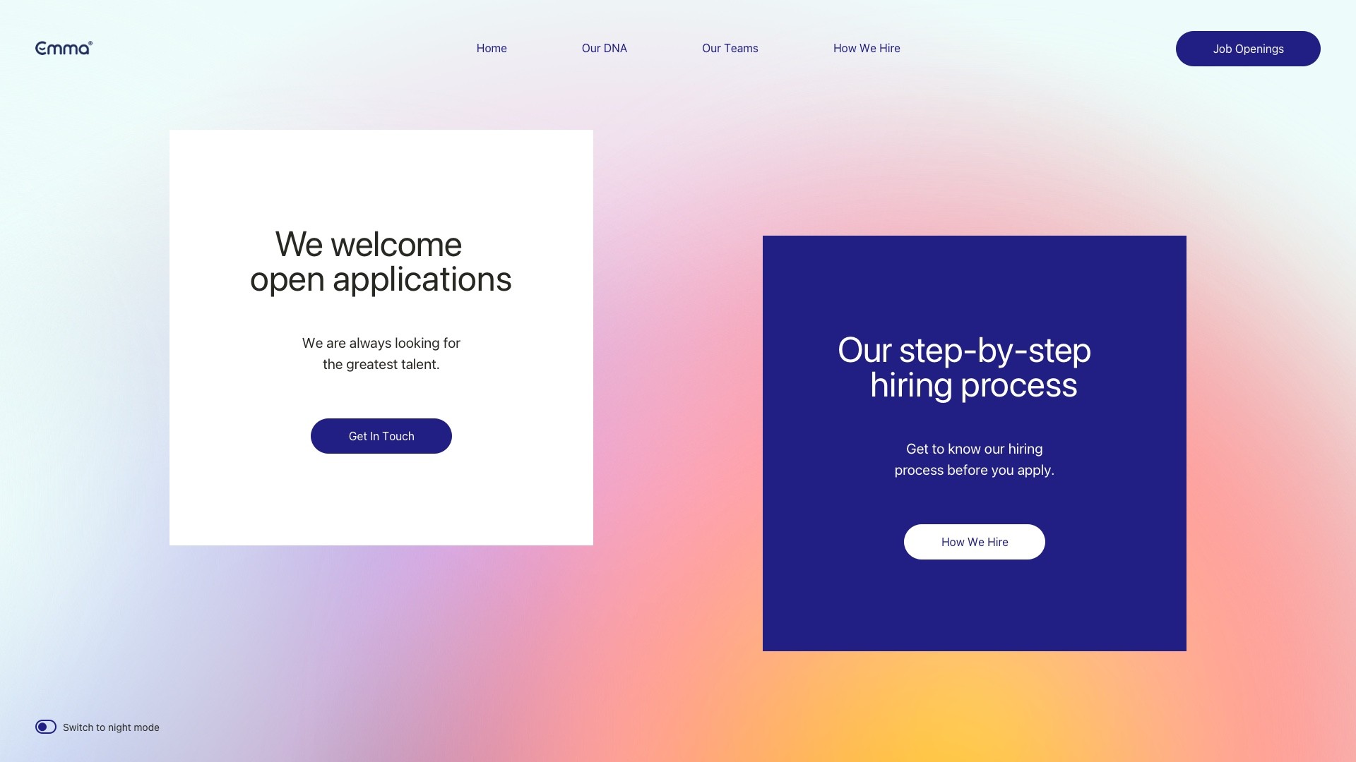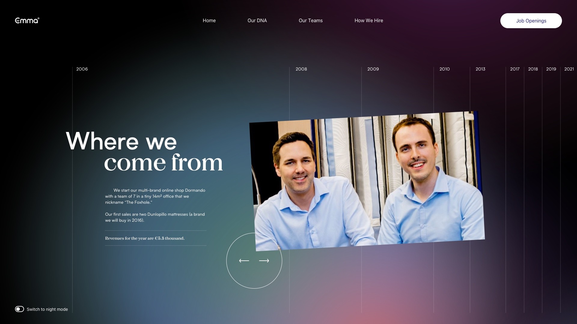 ↪ Transforming job search for the most innovative sleep-tech company. Emma Sleep reached out to .monks for a refresh of their career website. Over the course of few months, we built them a platform that was flexible, inviting and innovative. Close collaboration with Emma Sleep's CEO Dennis Schmoltzi resulted in a website that truly represents the values, the ambition and the work ethic of this dynamic company.