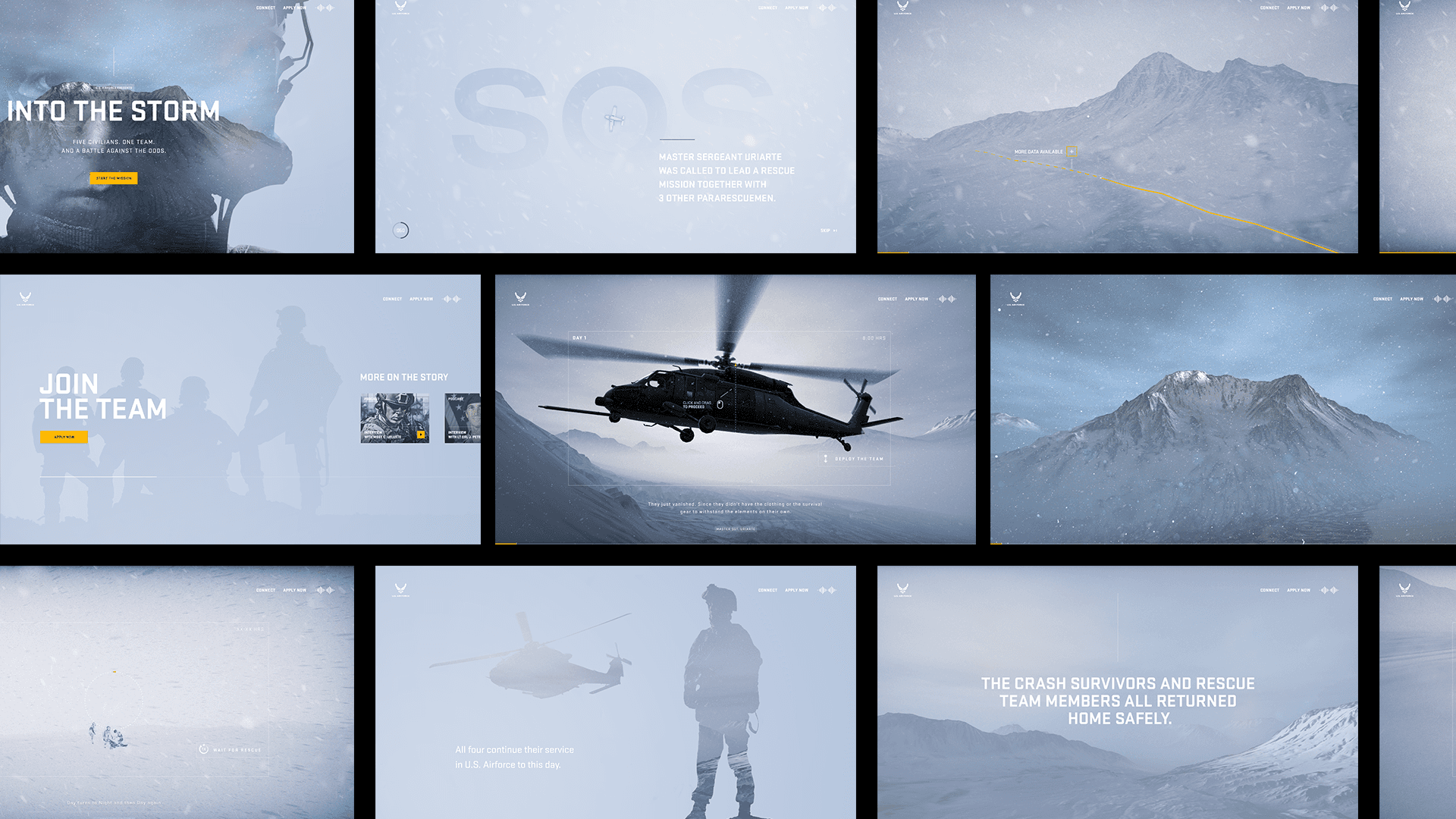 ↪ as a ux/ui designer at .monks, i contributed to into the storm, an interactive experience recreating a 2010 alaskan rescue mission. the project immerses users in the role of a pararescueman through intuitive hotspots, gestures, and responsive interactions that seamlessly blend with the unfolding story. designed for both mobile and desktop, the experience engages users while honoring the real-life challenges and decisions faced by these heroes, aiming to both captivate and inspire.